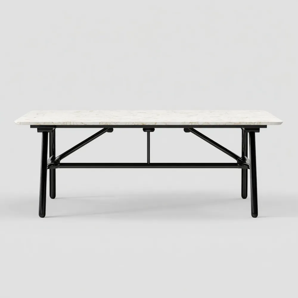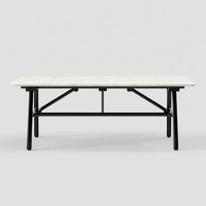 Material und VerarbeitungDie Tischplatte besteht aus hochwertigem Marmor in einer eleganten Weißen Farbe, verbunden mit einem robusten schwarzen Metallgestell, das für Stabilität sorgt.