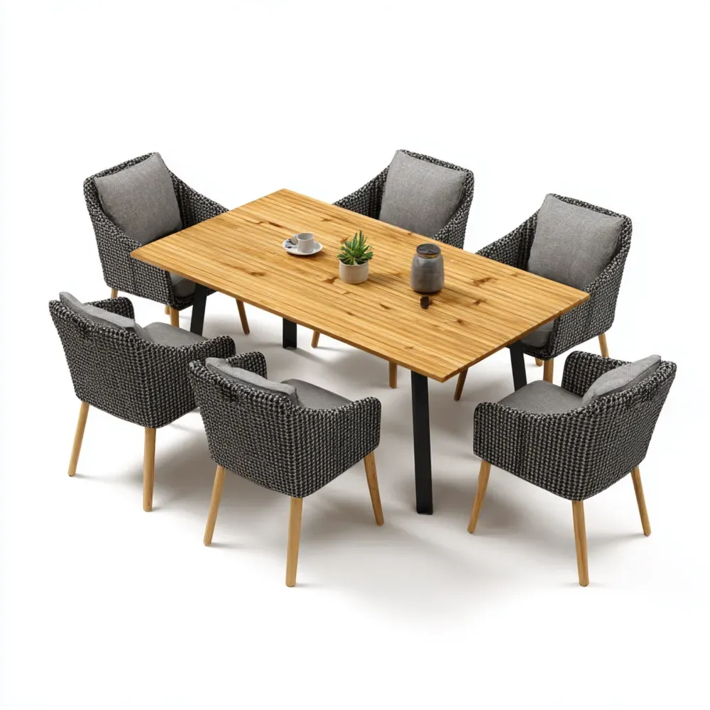 Material und VerarbeitungDer Tisch besteht aus robustem Holz, während die Stühle aus wetterfestem Rattangeflecht gefertigt sind. Die grauen Kissen bieten zusätzlichen Komfort.