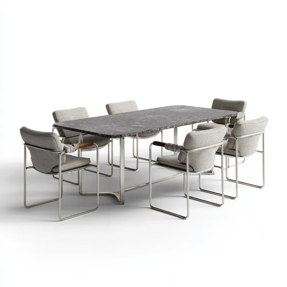Material und VerarbeitungDer Tisch ist aus widerstandsfähigem Material in Marmoroptik gefertigt, während die Stühle mit langlebigen Stoffbezügen in Grau ausgestattet sind. Das Metallgestell garantiert Stabilität und Langlebigkeit.