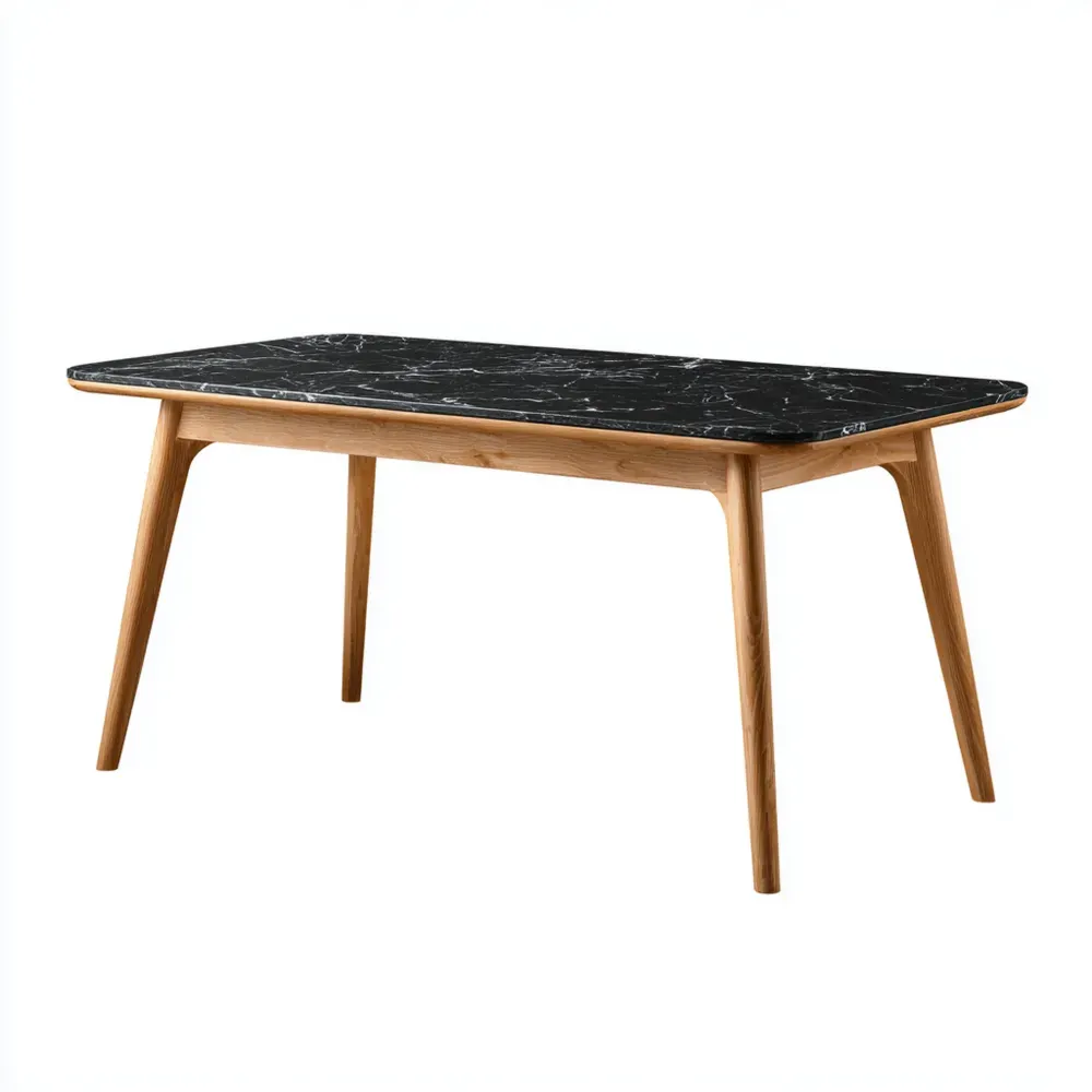 Der Tisch verfügt über eine hochwertige marmorierte Tischplatte in Schwarzer Farbe, die auf einem soliden Eichengestell ruht, bekannt für seine Langlebigkeit und Natürlichkeit.